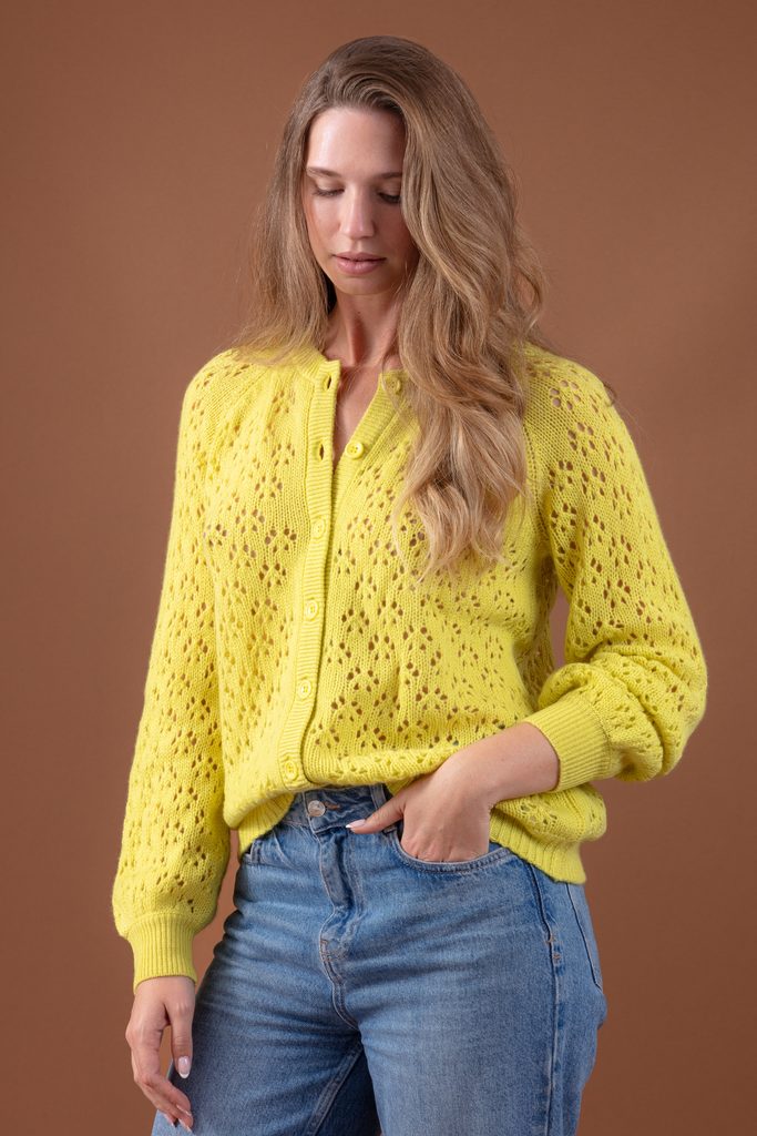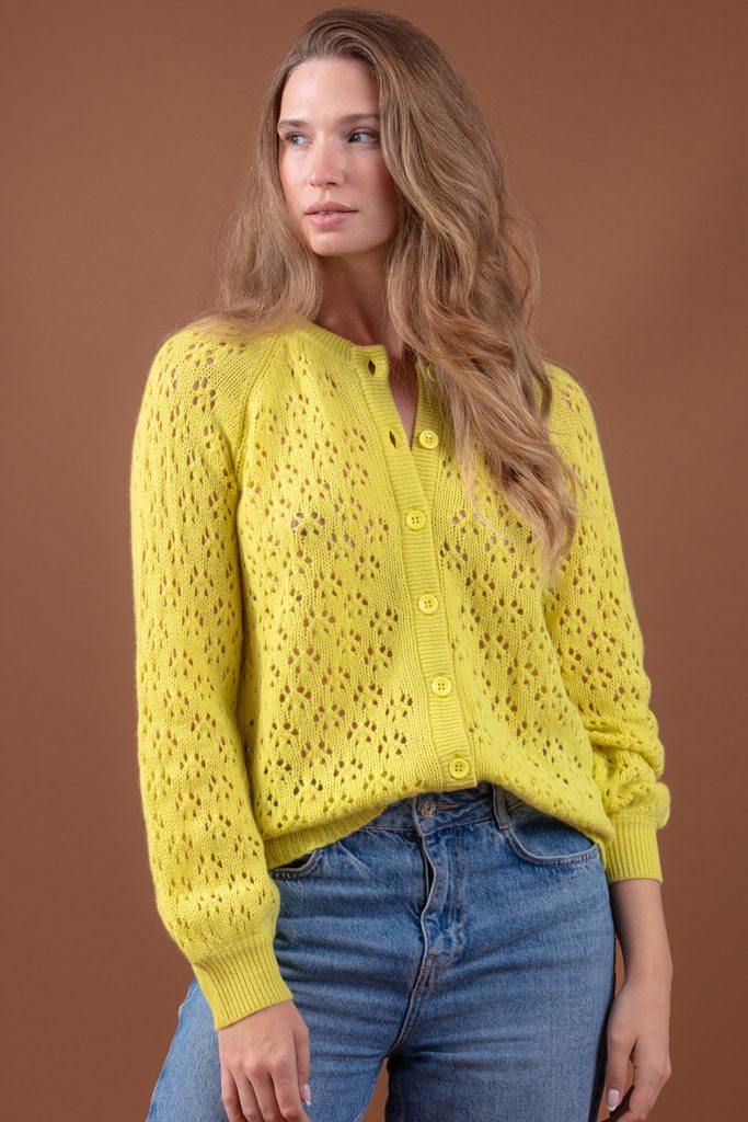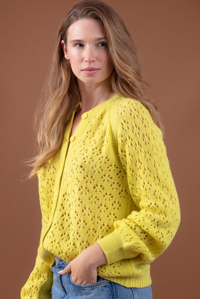 This buttoned cardigan features delicate raglan sleeves and a charming floral pattern, creating a soft, feminine shape. Wear it over a dress or with high-waisted trousers, or pair it with a crisp white shirt to highlight the openwork detail.